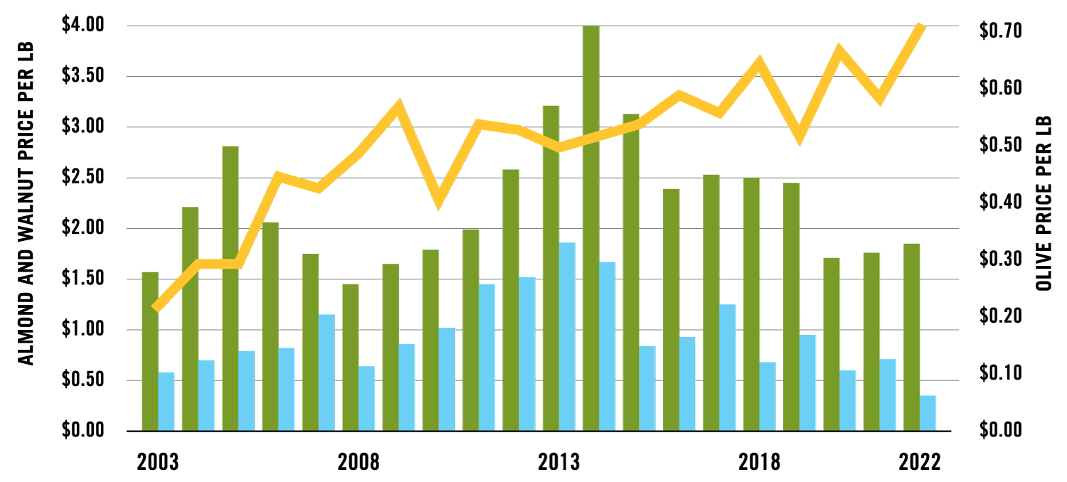 Historical data shows almonds and walnut profitably trending down over the last 7 years. Recent developments have driven a positive step change in economics making new olive plantings in California more attractive than ALL other tree crops.
